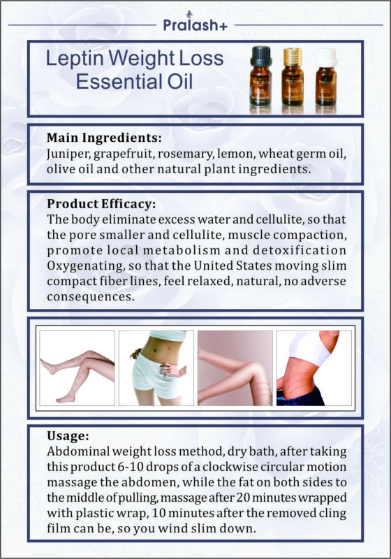 Abdominal losing weight method, after bathing and dry the skin, apply 6-10 drops on the abdomen, cycle-massage clock wisely. Pull both sides of flab in the middle, massage 20 minutes and wrapped it in the cling film. Then, take off cling film after 10 minutes, it can also be used for legs abdominal weight losing, and let you lose down quickly.\